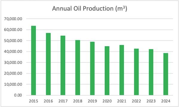 In 2024, total oil production was 38,653.99 m³, calculated from form 8 reports received in 2025. This represents a decline of ~9% from the previous year's production of 42,234.77 m³. Geographically, the majority oil production came from Lambton county (42%), Essex county