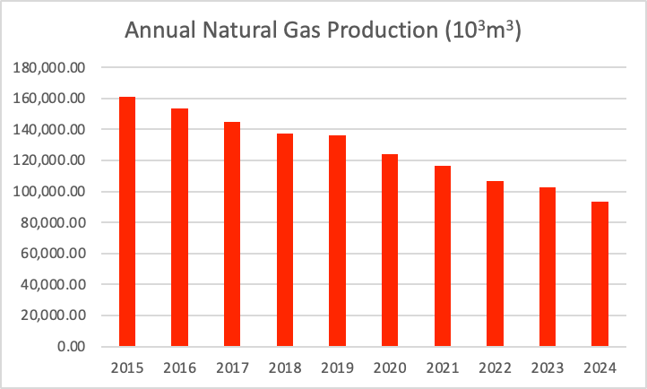 The total natural gas production in 2024 was 93,691.12 10³m³, calculated from form 8 reports received in 2025. This represents a decline of ~9% from the previous year's production of 102,422.90 10³m³. 72% of natural gas production came from wells in Lake Erie, with remaining production coming from Norfolk county (8%), Oxford county (5%), Elgin county (3%), with